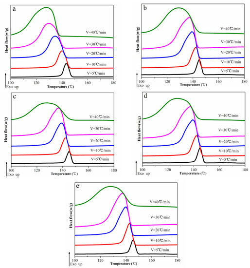 DSC cooling scan curves of POM/Ag nanocomposites with different Ag nanoparticle contents: (a) 0, (b) 0.1, (c) 0.5, (d) 1, (e) 2 wt % at the cooling rates of 5, 10, 20, 30 and 40 °C/min.
