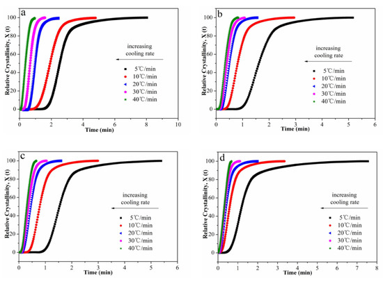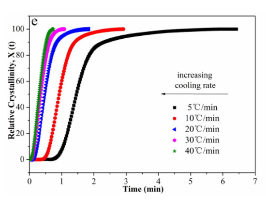 The calculation of the relative degree of crystallinity (X(T)) is displayed in Equation (3) [34]; the relationship between time (t) and temperature (T) was as given in Equation (4):