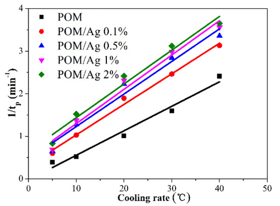 where ∆E and R are the crystallization activation energy and the gas constant, respectively. The fitted lines of ln(Φ/) versus 1/Tp for POM/Ag nanocomposites are shown in Figure 12, and the values of r and ∆E are listed in Table 6. The ∆E values of the POM/Ag nanocomposites indicated that Ag nanoparticles induced the heterogeneous nucleation in POM by lowering the activation energy of POM. In addition, it is known that the magnitude of activation energy (|∆E|) is related to energy need for the motion of polymer chains during the transformation from the melt into the crystalline state. The absolute values of ∆E for POM/Ag nanocomposites were greater than that for the POM, indicating that Ag nanoparticles increased the difficulty for the transport of POM molecular chains to the crystal region [41]. On one hand, it was shown that the as-synthesized Ag nanoparticles had a strong interaction with POM. On the other hand, when the amount of Ag nanoparticles increased, Ag nanoparticles easily to aggregated and inhibited the movement of the POM molecular chain, which affected the crystallization properties of the POM.