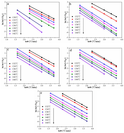 Plots of ln(−ln(1 − XT)) as a function of lnΦ for POM/Ag nanocomposites with different Ag nanoparticle contents: (a) 0, (b) 0.1, (c) 0.5, (d) 1, (e) 2 wt % at different fixed temperature.