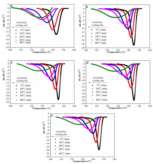 Crystallization rate (dX/dT) as a function of temperature for POM/Ag nanocomposites with different Ag nanoparticle contents: (a) 0, (b) 0.1, (c) 0.5, (d) 1, (e) 2 wt % at the cooling rates of 5, 10, 20, 30 and 40 °C/min.