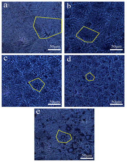 The spherulite morphology of POM was observed by polarized optical microscopy to investigate the effect of the Ag nanoparticles on the dynamic crystallization behavior of POM. Figure 13 displays spherulite morphology of the POM/Ag nanocomposites. As seen in Figure 13a, the POM spherulites had considerable size due to the low nucleation density of the pure POM, and spherulites directly collided with each other. In the observed areas, there were a few nuclei and spherulites with a diameter of approximately 100 μm, along with clear interfaces. In addition, Figure 13b–e shows that the size of spherulites of POM/Ag nanocomposites became small and that the amount of the spherulites increased significantly. Furthermore, during the crystallization process, Ag nanoparticles generated a great number of nuclei and the maximum number of available nucleation sites [42]. Simultaneously, Ag nanoparticles grew in a limited space and led to the formation of smaller spherulites in the composites, indicating that the nucleation density was the dominant factor affecting the crystallization process of the POM/Ag nanocomposites [43]. However, when the content of Ag nanoparticles was increased further to reach 2 wt%, Ag nanoparticles easily aggregated, which reduced heterogeneous nucleation of Ag nanoparticles and restrained crystallization of POM.
