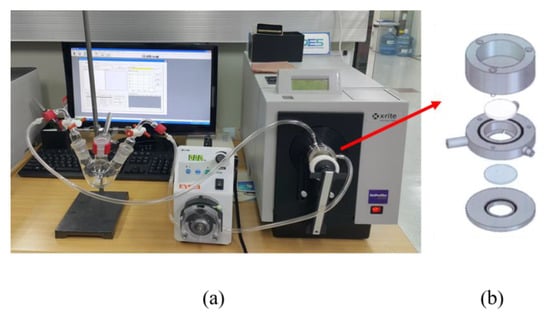 A new gas test system was designed, as shown in Figure 1, to measure the color change of the fabricated textile sensors in real time while being exposed to acidic gas. The sensors were placed in a stainless-steel chamber and the acidic gas at a controlled concentration was circulated through the Teflon tube connected to the chamber. Because the internal volume of the entire system was measured, the concentration of the acidic gas could be controlled by the amount of acid injected into the three-neck round bottom flask. The injected acid in the flask was evaporated by a heat gun, and the acidic gas was circulated in the entire system using a peristaltic pump. After exposure to the acidic gas, the dynamic color change of textile sensors was measured by a color-eye 7000A spectrophotometer (X-rite, Grand Rapids, MI, USA). The color change (ΔE) and surface color strength (K/S) was calculated using following Equation (1) [].
