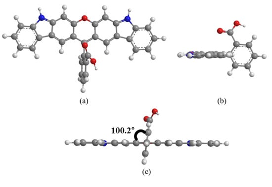Geometry-optimized structure of the synthesized dye: (a) Front; (b) Side; (c) Top.