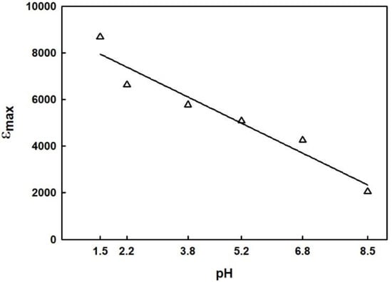 Plot of molar extinction coefficient at 550 nm as a function of pH for RhYK dye (2.61 × 10−4 mol·L−1) in MeOH.