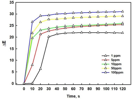 Time-dependent color differences of printed sensor for gaseous HCl at concentrations from 1 to 100 ppm.