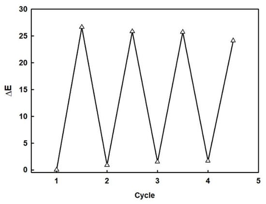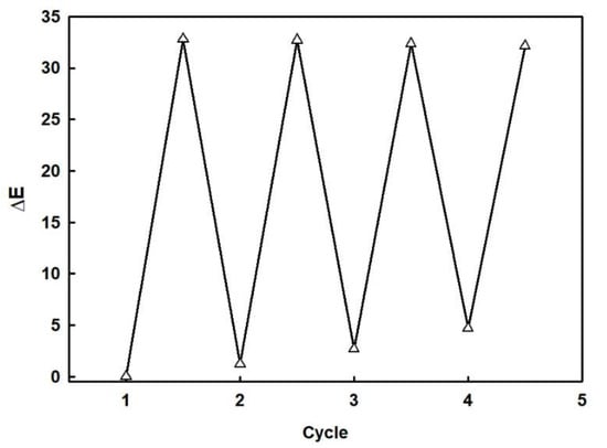 As shown in Figure 6, as the number of cycle increased, the initial color difference increased and the final color difference decreased. It is considered that this occurs due to the drop out of the dye during washing. Even after washing and drying four times, the color difference before and after detection showed high values over 20, indicating sufficient reusability of the dyed textile sensors.