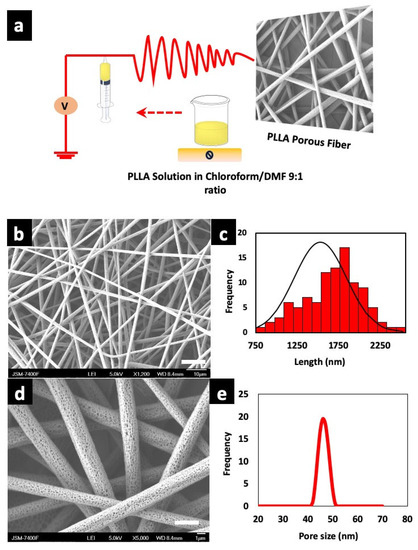 (a) Fabrication protocol of poly (l-lactic acid) (PLLA) porous scaffolds and schematic illustration of electrospinning device. (b) Scanning electron microscope (SEM) micrographs of as fabricated fibers (scale bar = 10 µm). (c) Corresponding diameter distribution of the fibers. (d) PLLA fiber with highly porous structure (scale bar = 1 µm). (e) Pore size distribution of unmodified fibers as observed under SEM.