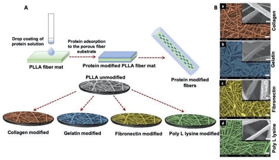 (A) Schematic illustration of protein functionalization on porous PLLA scaffolds. Simple drop coating of extracellular matrix (ECM) proteins to porous fiber surface was used for surface functionalization. (B) SEM micrographs of protein functionalized porous PLLA scaffolds (false color coded) (scale bar = 10 µm). The inserts are corresponding magnification of 5000× (scale bar = 1 µm). The magnified surface of fiber shows that pores of (a) PLLA collagen (c) PLLA Fibronectin (d) PLLA Poly L lysine are distinctively visible whereas (b) PLLA Gelatin fiber scaffold is covered with a layer of gelatin sheet.