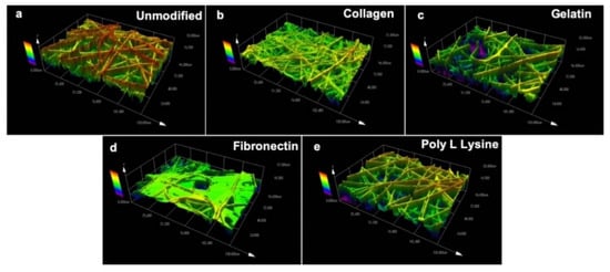 Topographical parameters play a pivotal role in directly influencing the cell response and regulating cell growth [51]. Therefore, topography of PLLA unmodified and protein modified fibers were evaluated using a laser scanning microscope (Figure 3). As with SEM observations (Figure 2), it could be seen that the surface topography was significantly changed after protein immobilization on the fiber surface. Figure 3a shows the topography of unmodified electrospun fibers with rigid surface morphology whereas the collagen modified fibers appeared to be thinner (Figure 3b) possibly due to the natural property of collagen itself [52]. The gelatin modified fibers were observed to have a thin sheet of gelatin wrapped over the PLLA fibers as seen in Figure 3c. The fibronectin modified samples presented webbed structures engulfing most of the fiber surface (Figure 3d). However, the poly L lysine modified fibers were in close resemblance with unmodified PLLA fiber scaffold and the surface pores were visible even after the modification. As for the fiber mat thickness post-protein modification, the values were similar to that of the unmodified samples with insignificant variations.