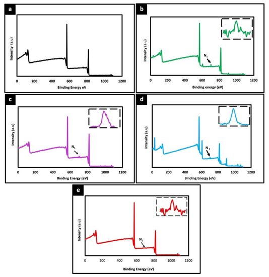 The surface chemical composition of electrospun unmodified and protein modified fiber were analyzed by XPS. Figure 4 shows the wide scan spectra of PLLA unmodified and different protein modified samples. Two peaks corresponding to C1s (285 eV) and O1s (532 eV) were observed with all the samples. Additionally, a distinct N1s peak at 400 eV was observed in all protein modified samples (Figure 4b–d), whereas no such peak was detected in unmodified PLLA (Figure 4a). As the unmodified PLLA fibers do not harbor any source of Nitrogen species themselves the N1s signal is bound to be due to the protein modification, thereby confirming the successful immobilization of proteins on the fiber surface, correlating with the microscopic observations in Figure 2 and Figure 3. Further, the thermal stability of unmodified and protein modified PLLA scaffolds were examined by DTA and TGA. The decomposition temperature depicts the maximum processing temperature of each sample. The T onset temperature of sample is calculated as the temperature at which the sample exhibits 1% weight loss. The corresponding thermograms of DTA and TGA are shown in Figure S1a,b. In comparison with protein modified and unmodified fibers, not much significant difference was observed in thermal degradation behavior. However, all the scaffolds exhibited a thermal degradation initiation at slightly different temperatures, unmodified-337.43 °C, collagen-322.70 °C, gelatin-318.67 °C, fibronectin-310.54 °C and poly L lysine-335.98 °C. As the initial weight of all samples were constant, this slight shift in the initiation of thermal degradation can be attributed to the protein immobilized on the surface of the fibers. Also, there is no distinct difference in the thermal behavior of protein functionalized fibers which could be associated with low concentration blend of surface functionalized proteins.