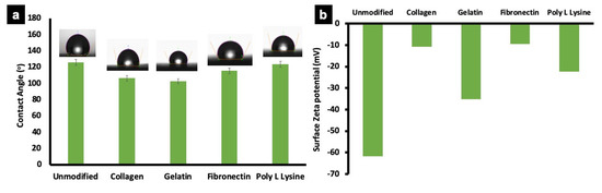 Wettability (Surface hydrophobicity) of unmodified and protein modified fiber scaffolds were determined by sessile drop method. Water contact angle on a substrate reflects its hydrophilic/hydrophobic nature, which is a crucial factor influencing cell adhesion and protein absorption on any substrate. Surface hydrophobicity greatly influences the cell behavior on a scaffold [53,54]. The water contact angle of unmodified PLLA fiber was 125.5 ± 7.5° depicting its hydrophobic nature (Figure 5a). Similarly, the collagen and gelatin modified fibers showed contact angles of 106.2 ± 2.5° and 102.7 ± 2.5° respectively, which could be attributed to the change in surface characteristics after protein modification as confirmed by zeta potential measurements (Figure 5b), −61.7 (unmodified), −10.7 (PLLA collagen), −35.7 (PLLA gelatin), −9.5 (PLLA fibronectin) and −22.5 (PLLA lysine). However, the water contact angle of poly L lysine and fibronectin coated samples showed no significant decrease (115.5 ± 25° and 123.4 ± 6.5°, respectively). It could be assessed that the unmodified and protein modified substrates are hydrophobic with contact angles ranging from ~122°–102°. Previous reports are suggestive that hydrophobic polymer matrix greatly supports cell attachment in comparison with highly hydrophilic natural and synthetic materials such as cellulose with lower contact angle of ~18° [55]. Additionally, the cumulative results from SEM, confocal laser scanning microscope (CLSM), wettability and zeta potential substantially prove that the proteins are successfully immobilized on the surface of the fibers.