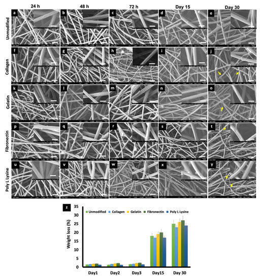 SEM micrographs depicting the changes in morphology of (a) 24 h, (b) 48 h, (c) 72 h, (d) Day 15, (e) Day 30 PLLA unmodified, (f) 24 h, (g) 48 h, (h) 72 h, (i) Day 15, (j) Day 30, PLLA collagen, (k) 24 h, (l) 48 h, (m) 72 h, (n) Day 15, (o) Day 30, PLLA gelatin, (p) 24 h, (q) 48 h, (r) 72 h, (s) Day 15, (t) Day 30, PLLA fibronectin and (u) 24 h, (v) 48 h, (w) 72 h, (x) Day 15, (y) Day 30. PLLA poly L lysine electrospun scaffolds after being immersed in PBS 7.4 for different time point at 37 °C at Day 0, Day 2, Day 3, Day 15, Day 30. (scale bar = 10 µm). Inset images are magnifications of the corresponding surface (scale bar = 1 µm). Salt crystal accumulation on the fiber surface can be observed along with the thinning of fibers due to gradual degradation after 30 days of incubation in PBS. (indicated by yellow arrows) (z) Weight loss percentage of electrospun PLLA and different protein functionalized scaffolds during 30 days of degradation in phosphate buffer saline (PBS).