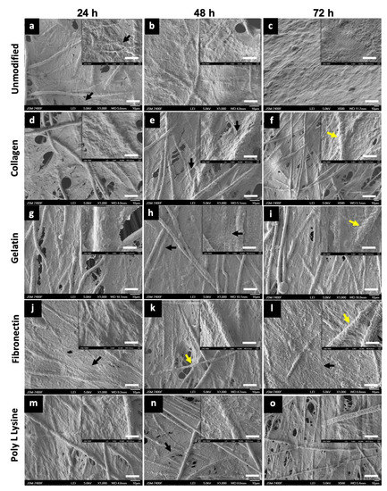 Scanning electron microscope (SEM) images of AHCF cultured on unmodified PLLA and protein modified fibers (scale bar = 10 µm). Adult human cardiac fibroblasts (AHCF) cells can be seen freely spreading on the entire stretch of the scaffolds. The extensive filopodia (black arrow) extended to long distances interconnecting numerous cells and forming a complex network. Fibers can be seen completely engulfed (yellow arrows) by the cellular bodies. These observations suggest the high compatibility of the scaffolds towards the attachment and proliferation of cells. Insets are magnifications of the corresponding surface (scale bar = 1 µm). (a) 24 h, (b) 48 h, (c) 72 h, PLLA unmodified, (d) 24 h, (e) 48 h, (f) 72 h, PLLA collagen, (g) 24 h, (h) 48 h, (I) 72 h, PLLA gelatin, (j) 24 h, (k) 48 h, (l) 72 h, PLLA fibronectin, (m) 24 h, (n) 48 h, (o) 72 h, PLLA Poly L Lysine.