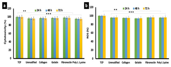 Once visual confirmation of cellular presence on the scaffolds was obtained (Figure 8), further cytocompatibility tests were conducted. AHCF were cultured on PLLA unmodified and protein modified substrates for 24, 48 and 72 h. Cells grown on conventional tissue culture plastic (TCP) were used as controls. The results were indicative that surface modification did not exert any deleterious effects on the cells (Figure 9a). The cellular viability for protein modified and unmodified sample were above 90% at all time points and on par with the controls. However, a slight (negligible) decrease in cell viability was observed after 48 and 72 h on PLLA scaffolds. Furthermore, the cell adhesion to the fiber substrate arbitrates via strong interactions and chemical composition of the biomaterial matrix and ECM composition [58]. Thus, our results are suggestive that none of the scaffolds exerted any apparent toxicity to the cells and exhibit excellent biocompatibility. These results are correlative of the SEM observations (Figure 8) where nearly all the cells observed did not show any signs of cytoplasmic (cell body) shrinkage or presence of apoptotic bodies, depicting the viable nature of the cells on the respective scaffolds.