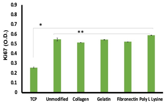 Ki67, a cellular proliferation marker was recorded to be at higher expression levels in cells cultured on the unmodified and protein modified porous PLLA scaffolds than in the tissue culture plastic (TCP) substrates. The expression difference was a significant 2-fold increase in the fiber scaffolds than TCP. These observations are highly supportive of the enhanced compatibility the scaffolds share with the cells than conventional culture ware. (n = 3, * p < 0.05,** p < 0.01).