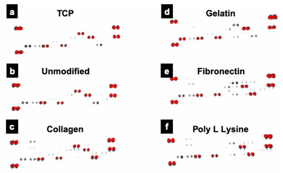 Also, there are many different analytes expressed by cells grown on different substrates as shown in Table S2. The variant protein profiles of each substrate indicate that the mechanotransduction pathways are variant with each surface modification type. Most of the proteins shown in Table S2 are angiogenic proteins that are involved in endothelial and pericyte proliferation/activation/migration. It indicates that these specific substrates grown fibroblast cells can activate select angiogenic proteins that could act by paracrine action on endothelial/pericytes. This indicates that these electrospun fiber substrates could help in homotypic and heterotypic cell interactions contributing to the organized structure and proper functional analysis [62]. Apart from the exciting prospects of humanized organoids-on-a-chip, in vitro multicellular cardiac co-culture models, in vivo regenerative cardiac patches, cardiac tissue engineering, these scaffolds could also play a crucial role in small to large scale drug discovery processes.