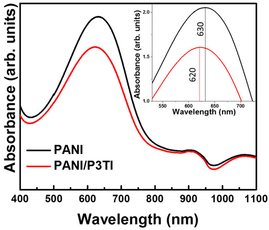 To determine the transition of the excited state, we used UV–VIS spectroscopy to examine the absorption spectra of PANI and PANI/P3TI, as shown in Figure 1. The absorption spectra of PANI show the highest peak at 630 nm of the optical light source, which represents the blue color of the PANI emeraldine base. After P3TI was doped into the solution, the highest peak shifted slightly to a lower wavelength at 620 nm. It can be seen that the optical properties of the sensing material was almost unchanged when doped with P3TI. Thus, the absorbance at a wavelength of 620 nm was used for VOC detection.