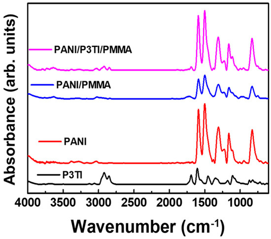 FTIR spectra of PANI/PMMA, PANI/P3TI/PMMA, pristine PANI, and P3TI.