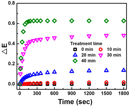 To improve VOC sensing performance, we studied the various UV/ozone treatment times, which is the critical parameter to change the response in VOC sensing. Figure 4 shows the extinction change of PANI/P3TI/PMMA fibers exposed to 2000 ppm n-butanol for 1800 s with various UV/ozone treatment times ranging from 0 to 40 min. Due to the low surface energy of thermoplastics, and the derived hydrophobicity or weak hydrophilicity [34], the bonding strength between PANI/P3TI/PMMA fibers and VOC molecules is limited and tends toward low sensitivity. It is noted that the response of the sensing fibers without treatment and with 10 min treatment was nearly unchanged when exposed to 2000 ppm n-butanol vapor for 1800 s. Afterward, with the UV/ozone treatment for more than 20 min, the ester group on PMMA quickly becomes oxidized with ozone, and then produced hydroxyl groups (–OH). These hydroxyl groups create hydrogen or covalent bonds on the surface fibers, suggesting that the surface energy of PANI/P3TI/PMMA fibers would be increased. Therefore, the extinction change of the fibers dramatically increased when the treatment time was prolonged from 20 to 40 min. However, PANI/P3TI/PMMA fibers were unstable in high relative humidity conditions as the treatment time was up to 40 min, as shown in Figure S4. According to the result, the acceptable treatment times are 20 and 30 min due to the stable and effective response to n-butanol.