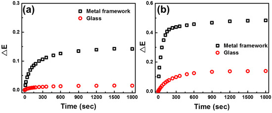 We have successfully harvested the PANI/P3TI/PMMA fibers with a metal framework. The extinction change at 620 nm of PANI/P3TI/PMMA fibers with different substrates, when exposed to 2000 ppm n-butanol, is shown in Figure 5. The PANI/P3TI/PMMA fibers deposited on the glass substrates were only exposed to VOCs with a single side, while those loaded on the metal framework substrates provided double faces exposed to VOCs. Moreover, during the surface treatment, the fibers can be comprehensively bared to ozone due to the double-side exposure as loaded on the metal framework. This would boost the efficiency of the surface treatment. Compared to glass substrates, the response of PANI/P3TI/PMMA fibers on metal framework substrates was significantly magnified about nine times with 20 min UV/ozone treatment (Figure 5a), and three times after 30 min UV/ozone treatment (Figure 5b), respectively. Thus, 30 min of UV/ozone treatment time was chosen for further study.