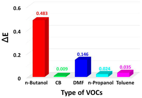 The relationship between VOC vapor concentration and extinction change was discovered. We demonstrated the calibration curve of ∆E toward the concentration of VOC vapors, fitted by the experimental data, and shown as follows: ∆E = k⋅C + A, where k is the sensitivity coefficient, C is the concentration of VOC vapors, and A is a constant [37]. In Figure 7b, the calibration curves for n-butanol vapor is ∆E = 0.0002C + 0.0337.