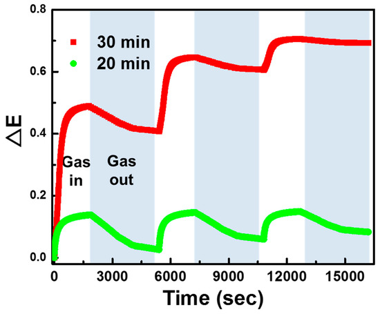We also investigated the reversibility of PANI/P3TI/PMMA fibers. The response–recovery cycles of the sensing fiber were recorded three times at the same condition, exposed to 2000 ppm n-butanol, as shown in Figure 9. After the sensing material inserted into the chamber, the response of PANI/P3TI/PMMA fibers toward n-butanol vapor was very rapid, and the response times of sensing fibers with both 20 min and 30 min UV/ozone treatment were less than 10 s. However, PANI/P3TI/PMMA fibers with UV/ozone treatment for 30 min cannot recover to the initial state after long-time exposure to n-butanol. It is deduced that the sensing fibers were eclipsed by VOC vapor and deformed dramatically. Then, the initial extinction of every cycle would be altered, and the extinction change is limited. The extinction change after three cycles reduced from 0.483 of the first cycle to 0.099 of the third cycle. Interestingly, PANI/P3TI/PMMA fibers with UV/ozone treatment for 20 min show better reversibility. The extinction change of the sensing fiber almost recovered to the initial level. Nevertheless, the stability of the response was still limited, reduced from 0.140 to 0.079, and showed a low response. In summary, the UV/ozone treatment for PANI/P3TI/PMMA fibers reduces the reversibility but significantly increases the VOC response. It is indicated that the reversibility of PANI/P3TI/PMMA fibers can only be acceptable with fewer cycles, but the ultrasensitive response to VOCs is appropriate for the application of a disposable sensor.