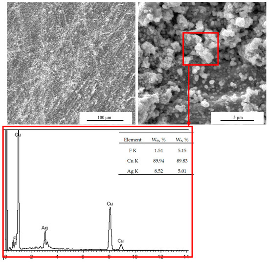 The surface morphology and EDS values of the Nafion membranes with deposited Cu electrodes are shown in Figure 1. Cu electrodes were deposited on either side of the membranes using a chemical plating method, and the presence of Cu on the surface of the IPMCs was confirmed by EDS measurements. The image of the surface indicates that the Cu coating is relatively uniform and smooth, which suggests good adhesion between the nafion film and the Cu particles. Remarkably, the Cu content revealed by EDS is 89.94% thus confirming that Cu particles were well deposited on the surface of membranes, to ensure a better conductivity and promotes current passage through the IPMCs under the voltage, and improves the actuation performance. It was also found that there was 8.52% silver on the electrode surface, which was mainly due to the reduction of Ag+ to Ag during the process of ion adsorption, which served as the activation nucleation site of copper, which promoted the formation of copper coating, leaving a small amount of silver on the electrode surface. And the sample contains about 1.54% by weight of fluorine from Nafion in Figure 1.