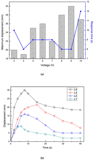 Displacements of the IPMCs with various lengths under different voltages. (a) relationships between the maximum displacement or the response time and voltage for L4 sample; (b) displacement–time curves of 9 V.