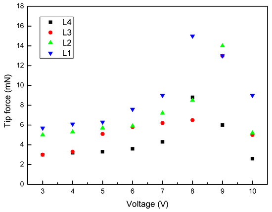 Figure 7 shows the tip forces of the IPMCs with various lengths under different voltages. As shown in previous studies [28,29], in general, the tip fore of all samples reached its peak value over a certain time period and then fastly decreased. The L1 and L4 continuously increased to the maximum tip forces of 15 mN and 8.8 mN at 8 V, respectively. Further, the L2 and L3 had maximum tip forces of 14.6 mN and 13 mN at 9 V, respectively. The suitable stimulation voltage for the maximum force output is 8–9 V. In summary, at a fixed voltage, the force output was seen to decrease with the length of the specimen.