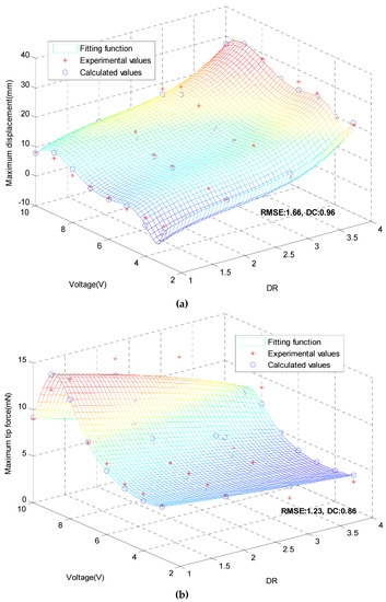 Experimental data were fitted in order to develop a model able to predict the response of the Cu-IPMC samples. The optimization software was utilized for that purpose. The dimension ratio (DR) and stimulation voltage are taken as two independent variables, while the dependent variables are displacement and force, respectively. If the initial values of unknown parameters are set improperly, the optimization process may hardly converge or even find incorrect results. Therefore, this paper uses the method of Levenberg–Marquardt (LM), starting from any random initial value, and finally finding out the optimal solution by iterative optimization algorithm.