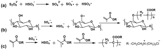(a) Formation of free radicals; (b) reaction mechanism of grafting DMC onto cotton fiber in the presence of K2S2O8/NaHSO3; (c) homopolymerization of DMC.