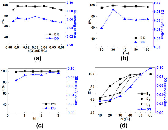 The reaction temperature was examined as presented in Figure 2b and the other reaction conditions are: 50 g/L of DMC, 0.01:1 of c(O)/c(DMC) and 3 h of reaction time. The results showed that temperature had great effect on graft polymerization. When the temperature increased from 20 °C to 30 °C, DS increased from 0.0429 to 0.0843 mmol/g; when the temperature further increased, DS decreased on the contrary. The highest dye exhaustion of near 100% also appeared when the reaction temperature was 30 °C. It is reported higher temperature is not only good for chain initiation and transfer, it also benefits chain termination of graft polymerization; moreover, temperature increase also accelerates homopolymerization. Therefore, the graft ratio of DMC on cotton will be adversely affected at higher temperature. With the further increase of temperature, the pyrolysis of potassium persulfate at high temperature produced more free radicals, which alleviated the downward trend [38,39].