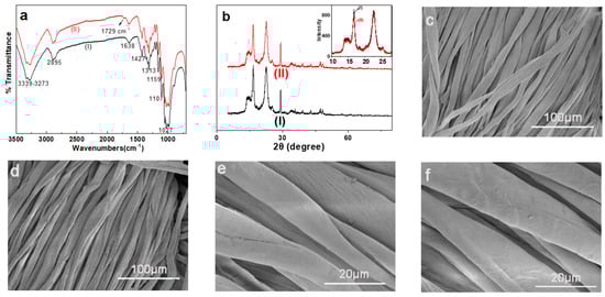 (a) ATR-IR spectra of the original (I) and the modified cotton fibers (II); (b) X-ray diffraction patterns of the original (I) and the modified cotton fibers (II); (c,e) SEM images of the original cotton fibers and (d,f) SEM images of the modified cotton fibers ((c,d) ×1000, (e,f) ×5000).
