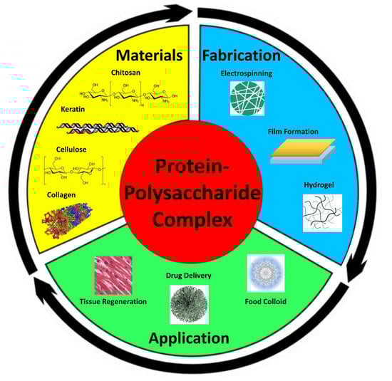 Protein–polysaccharide composites have been known to show a wide range of applications in biomedical and green chemical fields. These composites have been fabricated into a variety of forms, such as films, fibers, particles, and gels, dependent upon their specific applications. Post treatments of these composites, such as enhancing chemical and physical changes, have been shown to favorably alter their structure and properties, allowing for specificity of medical treatments. Protein–polysaccharide composite materials introduce many opportunities to improve biological functions and contemporary technological functions. Current applications involving the replication of artificial tissues in tissue regeneration, wound therapy, effective drug delivery systems, and food colloids have benefited from protein–polysaccharide composite materials. Although there is limited research on the development of protein–polysaccharide composites, studies have proven their effectiveness and advantages amongst multiple fields. This review aims to provide insight on the elements of protein–polysaccharide complexes, how they are formed, and how they can be applied in modern material science and engineering.