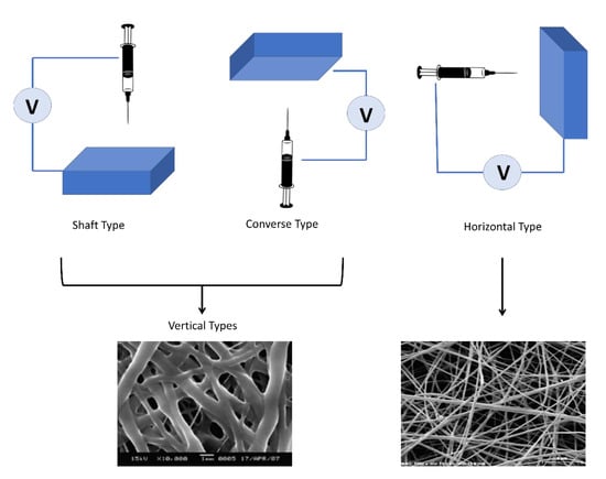 - Yang, C.; Jia, Z.; Xu, Z.; Wang, K.; Guan, Z.; Wang, L. Comparisons of Fibers Properties between Vertical and Horizontal Type Electrospinning Systems. In Proceedings of the 2009 IEEE Conference on Electrical Insulation and Dielectric Phenomena, Virginia Beach, VA, USA, 18–21 October 2009; pp. 204–207. [Google Scholar]