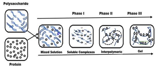 Formation of protein–polysaccharide gel complexes at different stages (reproduced with permission from [] Copyright Elsevier, 2017).