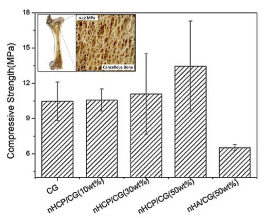 An ideal composite material for bone regeneration should be biodegradable to allow the replacement of new bone to grow properly, mechanically robust to temporarily support the new bone formation, and biocompatible to facilitate early mineralization. Li et al. fabricated bulk multicomponent polysaccharide/nano-hydroxyapatite (nHA) composites to investigate the physico-chemical, mechanical, and biological properties suitable for bone regeneration (Figure 7) []. The multicomponent composite consisted of a combination between nHA and chitosan, gelatin, and pectin. There were other combinations used for comparison, such as nHA/chitosan–gelatin and nHA/chitosan–pectin. Similar to the other materials, the bulk composite was produced using nHA/chitosan–pectin mixed with chitosan–gelatin through mineralization. It required a more extensive procedure, using glutaraldehyde as the crosslinking agent []. All the composites were fabricated to form a scaffold through a freeze-dry method.