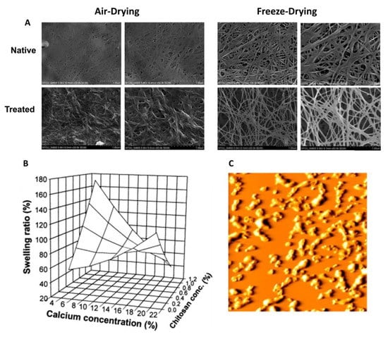 Post treatments on protein–polysaccharide complexes have been done chemically or physically to improve the material properties of the composite []. Depending on the desired application of the composite, the method can be tuned to reach the desired outcomes. Alternate drying or freezing conditions can be used with different timings to produce two completely different physical characteristics. Techniques such as these are commonly used in industry. In one study, a protein–polysaccharide composite of collagen and sodium alginate with a sponge-like appearance had water removed by freeze drying to control the pore size in the samples []. The small porous composites of about 20 μm were shown to be useful as a wound contact layer to allow the penetration of fibroblasts into the matrix, whereas the production of composites with larger pores of around 100 μm is desirable for materials used as a component of a burn dressing. Chemical dehydrothermal crosslinking and treatment with crosslinking agents, such as aldehydes, also increased the stability of the collagen–alginate composite by 50% after seven hours of soaking compared to the untreated complexes []. Physical and chemical post treatments are also done on different protein–polysaccharide composites.