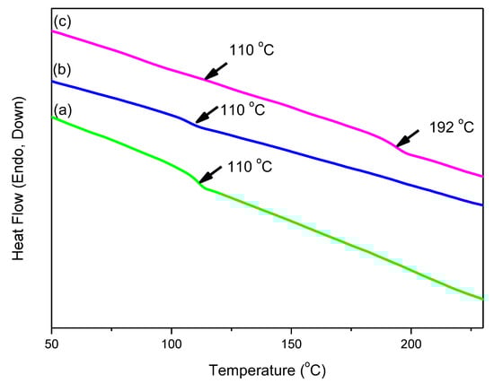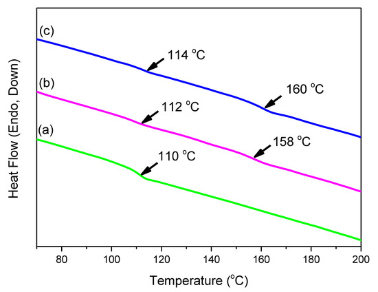 DSC thermograms of (a) PS-DDSQ-PS, (b) PtBuOS-b-PS-DDSQ-PS-b-PtBuOS, and (c) PVPh-b-PS-DDSQ-PS-b-PVPh.