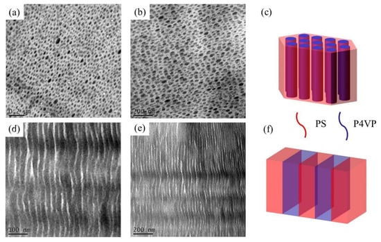 The self-assembled nanostructures (e.g., cylindrical, lamellar, spherical, and double-gyroid structures) that form from immiscible diblock copolymers (BCPs) have received much attention because of their potential applications in, for example, nano-patterning, drug delivery, and photonic crystals [1,2,3,4,5]. The blending of a homopolymer or a BCP into another BCP matrix, to mediate the volume fraction of the BCP segment, is a relatively facile means of obtaining various self-assembled nanostructures [6,7,8,9]. Positioning hydrogen bond donor or acceptor units into the block segments can alleviate macrophase separation in diblock copolymer mixtures; indeed, many experimental and theoretical studies have been undertaken into the preparation of such block copolymer/homopolymer and block copolymer mixtures [10,11,12,13,14,15,16,17,18].