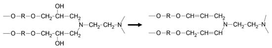 Investigations in thermal degradation of cured epoxies indicate resin backbone dehydration is the most facile reaction. Grassie et al. [3] examined degradation of cured DGEBA epoxy by analyses of volatiles. They concluded water was generated due to autocatalytic interaction among adjacent hydrogen and hydroxyl side groups. The structure change is depicted in Figure 2 where side group removal leads to carbon double backbone bonds. Additional evidence is mass loss from cured samples in thermogravimetric analyses (TGA) at low temperature [3,12,13]. Cheng [12] found losses as much as ten percent when temperature reached 200 °C from samples cured at 140 °C.