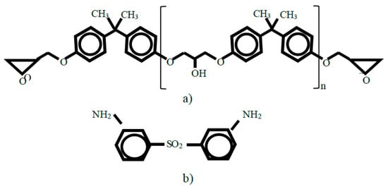 Figure 3. Structural diagrams of diglycidyl ether of bisphenol A (DGEBA) (a) and 3,3′ diamino diphenyl sulfone (3,3′ DDS) (b).