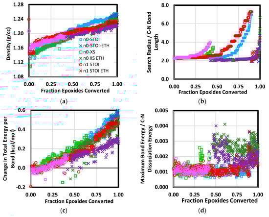 Figure 5. Quantities tracked during crosslinking simulation. Depicted are density (a), group–group search radius (b), change in total energy per bond (c), and maximum bond energy normalized by C–N bond dissociation energy (d). Labels including “ETH” correspond to the crosslinking stage in which both ether and amine crosslinks were formed. Labels “STOI” and “XS” correspond to stoichiometric and excess epoxide blends, respectively.
