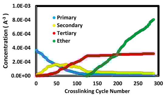 The progression of relative concentrations of amine types and ether increase during crosslinking is similar to findings from experiments [4,5]. Results for the long-chain (i.e., n = 1) excess epoxy system are shown in Figure 6. The initial consumption of primary amines is principally associated with secondary creation. Once approximately half the primary amines are consumed, the secondary concentration reaches a maximum and there is steady growth in tertiary amine concentration. Once the etherification criterion is met, the added ether concentration rises until nearly all epoxides are consumed.