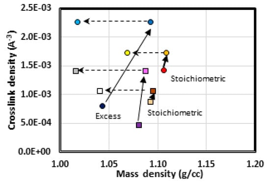 Figure 8. Crosslink density as a function of mass density. Changes due to etherification and dehydration are indicated by a solid and dashed arrows, respectively. Short- and long-chain resins are depicted by circles and squares, respectively. Stoichiometric and excess epoxide formulations are indicated.