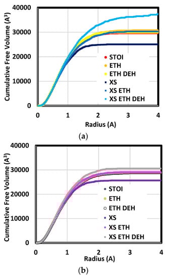 Small species diffusion rate and segmental motion frequency depend, in part, on free volume distribution [54]. Further, it has been demonstrated epoxy fracture toughness and shear modulus are functions of free volume fraction [55]. Results (shown in Figure 9) are presented as cumulative free volume as a function of radius. At a given radius, the cumulative free volume is the total free volume at this radius and smaller. Comparison among distributions reveals quantities and hole sizes which are more prevalent in each system type. Holes larger than 2.5 Å generally were not found. The exception was the short-chain system which had been etherified and dehydrated. This system included hole radii as large as 3.95 Å.