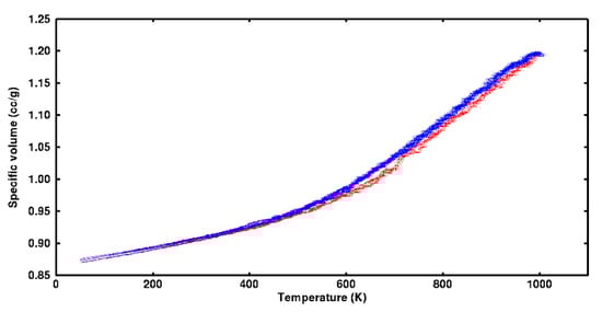 Given this evidence, it was presumed multiple transitions could exist. Because feasible cooling rates are high in MD, it was anticipated undercooling would occur as the sample completed a given transition. Each system was therefore alternately heated and cooled through several cycles at constant pressure (0 atm) while recording specific volume. Heating and cooling rates were 6.25 × 10−5 °K/fs. The constancy of the thermal expansion at the peak temperature (1000 °K) indicated all motions were active and systems therefore would be re-randomized before commencing with the subsequent cooling. There were 30,400 specific volume records were collected for each cycle. Data gathered during heating was segregated from cooling to isolate differences in system barrier crossing as energy was added or removed. The local slope and concavity (i.e., second derivative) of the data ensemble for specific volume as a function of temperature were computed. Slope was used to identify the range over which transitions were occurring. When there was a distinct peak in the concavity, this was taken to represent a transition. Data from several cycles was used to establish confidence intervals for slope and concavity. At extremely low or high temperature, slope was expected to be insensitive to temperature change.
