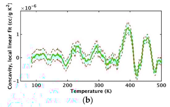 Given that physical experiments indicate transitions occur below 500 °K, data from 75 to 500 °K were analyzed for concavity peaks in specific volume as a function of temperature. Cooling data were used because undercooling resulted in distinct drops over narrow temperature ranges. At each temperature (75 to 500 °K in increments of 1 °K), a second order polynomial was fit to the data over a 50 °K range centered at the respective temperature. An example illustrating the significance of concavity variations is provided in Figure 11 which shows the results for the succession of fits at 1 °K intervals as well as a band representing the associated 95 percent confidence interval. The confidence interval is consistently less than the amount of variation in concavity. Further, peaks are more prominent for cooling than for heating.