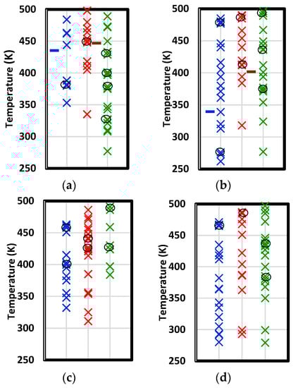 Figure 12. Temperatures of concavity peaks in the specific volume versus temperature plot upon cooling for short-chain stoichiometric (a), short-chain excess epoxide (b), long-chain stoichiometric (c), and long-chain excess epoxide (d) formulations. Symbols are colored according to: amine addition only (blue), amine addition and etherification (red), and subsequent dehydration (green). Points were obtained from five thermal cycles. Instances of least three peaks within a range of 10 K are circled. Fiducial marks in (a) and (b) are the measured Tg values of Gupta et al. [6] for cured (blue) and post-cured (brown) specimens.